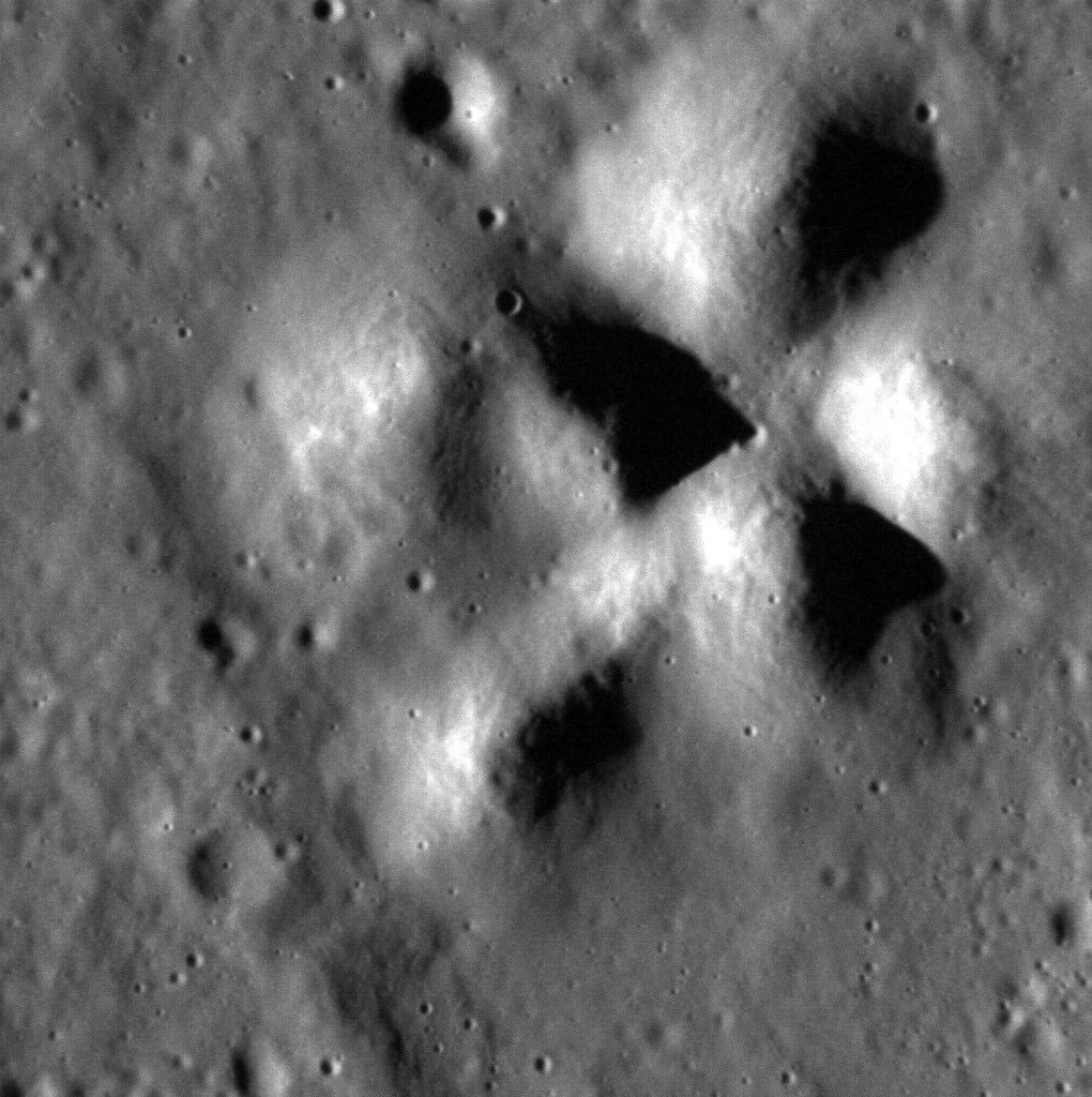 The central peaks of an unnamed 38-km crater fill this scene. The sun is coming from the left side of the frame, so that the peaks cast their shadows to the right. North is to the right in this image.