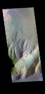 The THEMIS VIS camera contains 5 filters. The data from different filters can be combined in multiple ways to create a false color image. These false color images may reveal subtle variations of the surface not easily identified in a single band image. Today's false color image shows part of Juventae Chasma. Dunes are visible on the floor of the chasma.