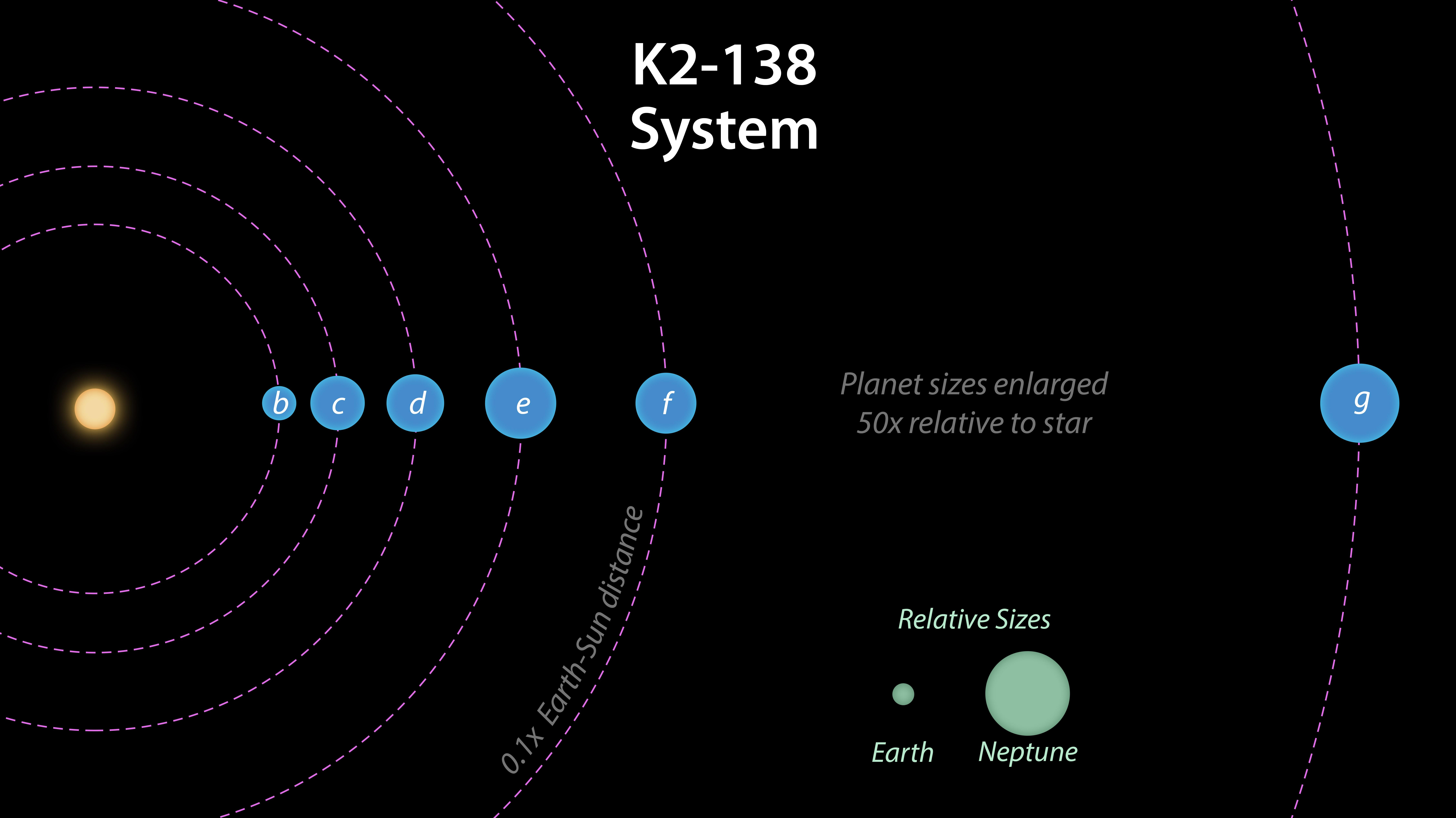 This image shows the estimated radii of the six planets in the planetary system K2-128, as well as their distance from the parent star. The radii of the Earth and Neptune are shown for scale.
