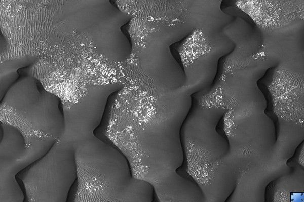 Winds have trapped massive quantities of sand on the floors of broad craters in this region. The steepest slopes on each dune, the slip faces, point to the east indicating that the dominant wind direction in this part of the dune field is from west to east. Patches of seasonal frost can be seen in the low areas between the dunes.