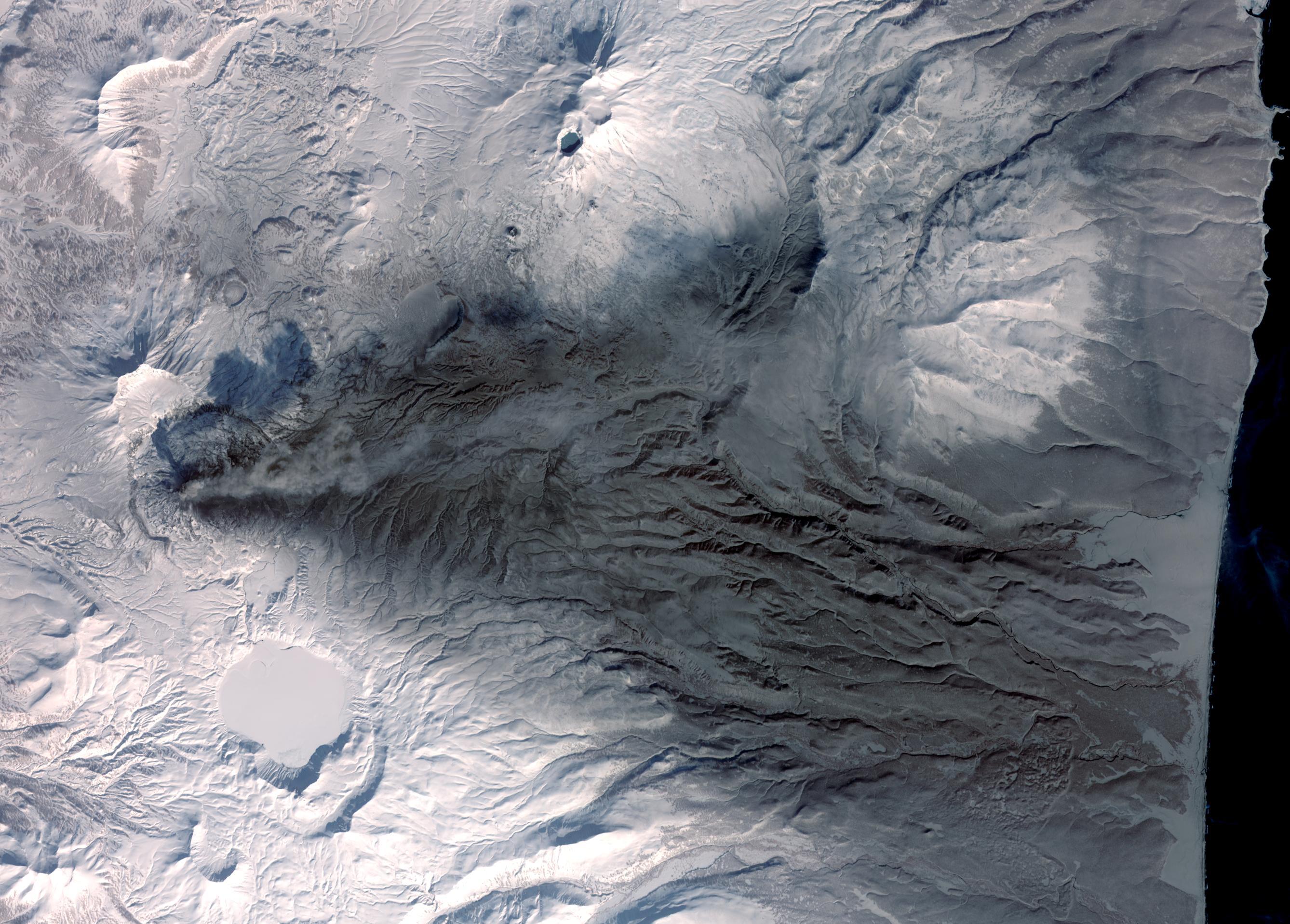 Early March eruptions of Karymsky volcano on Russia's Kamchatka Peninsula left the usually white snow a gray ashy color. The ashfall forms a triangle extending from the stratovolcano's summit eastward to the coast. Karymsky is the most active volcano of Kamchatka's eastern volcanic zone. The latest eruptive period began about 500 years ago after a 2300-year period of quiescence.
