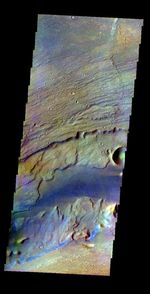 The THEMIS VIS camera is capable of capturing color images of the martian surface using its five different color filters. In this mode of operation, the spatial resolution and coverage of the image must be reduced to accommodate the additional data volume produced from the use of multiple filters. To make a color image, three of the five filter images (each in grayscale) are selected. Each is contrast enhanced and then converted to a red, green, or blue intensity image. These three images are then combined to produce a full color, single image. Because the THEMIS color filters don't span the full range of colors seen by the human eye, a color THEMIS image does not represent true color. Also, because each single-filter image is contrast enhanced before inclusion in the three-color image, the apparent color variation of the scene is exaggerated. Nevertheless, the color variation that does appear is representative of some change in color, however subtle, in the actual scene. Note that the long edges of THEMIS color images typically contain color artifacts that do not represent surface variation.