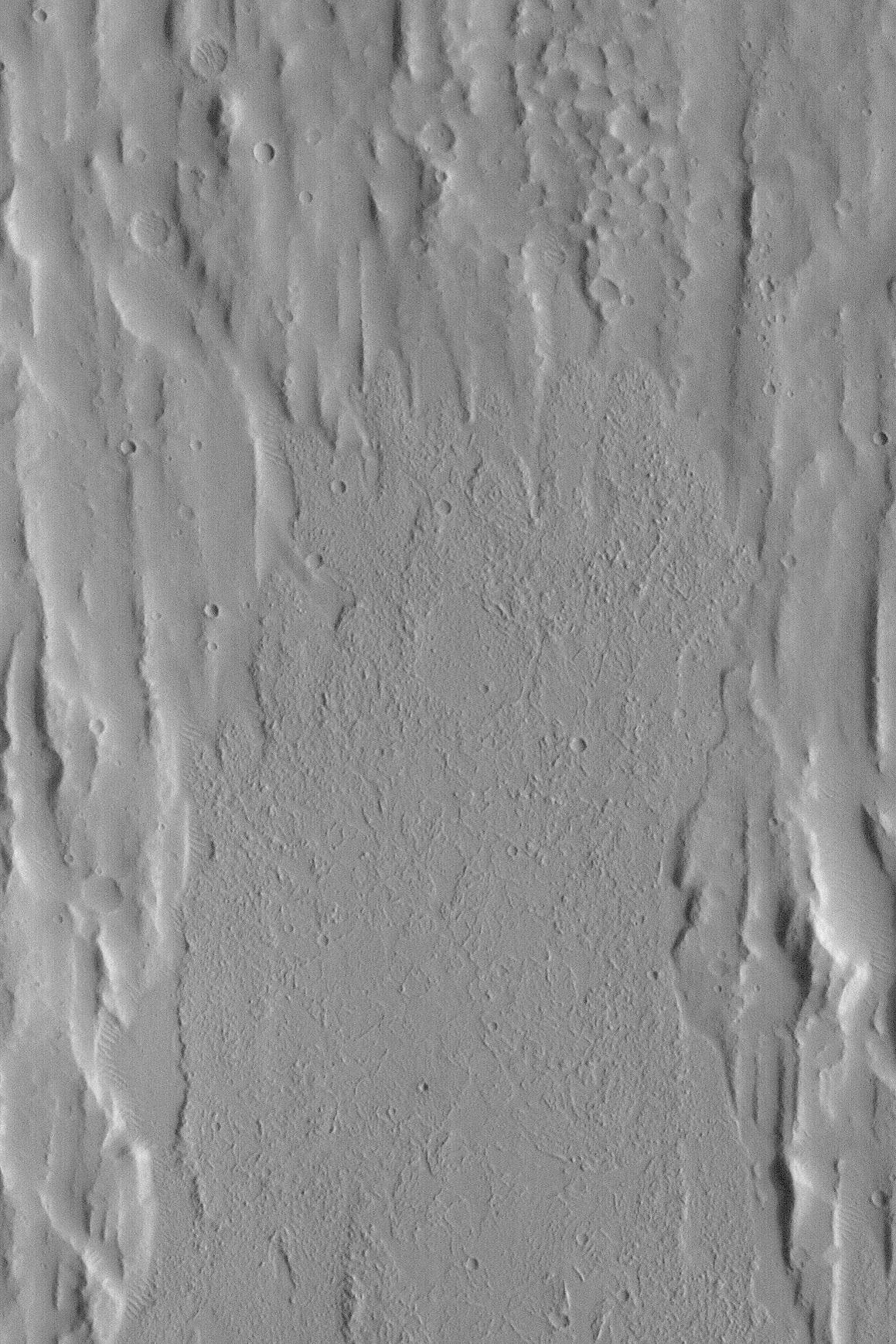 This Mars Global Surveyor (MGS) Mars Orbiter Camera (MOC) picture shows the lobate fronts of a large flow or series of smaller flow features in Kasei Valles. The rubbly surface of the flow has been interpreted to suggest that this might have been a mud flow, rather than a lava flow, but final determination will someday require a person to visit this landform "in the field." This picture is illuminated from the right and covers an area approximately 8 km (5 miles) wide near 15.7°N, 77.7°W.