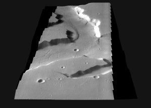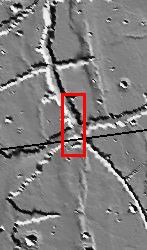 The MOLA context image of Kasei Valles suggests the observed channels may be partly structurally controlled due to their rectilinear pattern. However, the high-resolution THEMIS image shows grooves within the channels that can be interpreted as evidence for fluvial activity. This relationship suggests that the initial channel formation was structurally controlled, and that once formed, the channels provided a conduit for movement of material.