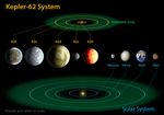 The diagram compares the planets of the inner solar system to Kepler-62, a five-planet system about 1,200 light-years from Earth in the constellation Lyra. The five planets of Kepler-62 orbit a star classified as a K2 dwarf, measuring just two thirds the size of the sun and only one fifth as bright. At seven billion years old, the star is somewhat older than the sun.