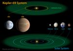 The diagram compares the planets of the inner solar system to Kepler-69, a two-planet system about 2,700 light-years from Earth in the constellation Cygnus. The two planets of Kepler-69 orbit a star that belongs to the same class as our sun, called G-type.