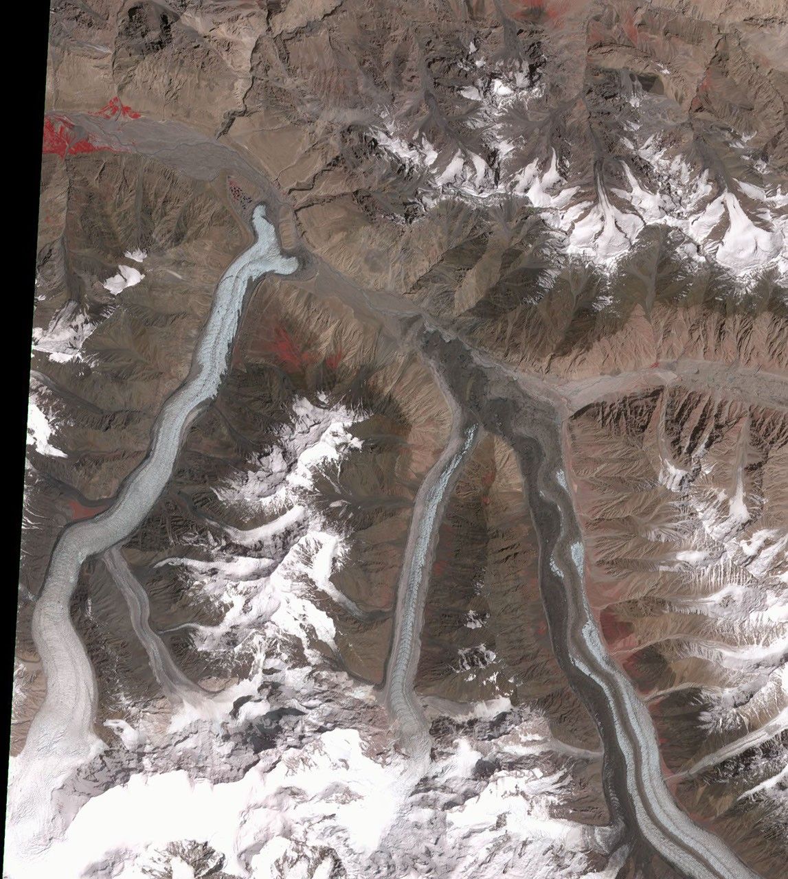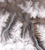 In October 2016, the Khurdopin Glacier in Pakistan began a rapid surge after 20 years of little movement. By March, 2017, a large lake had formed in the Shimshal River, where the glacier had formed a dam. Fortunately, the river carved an outlet through the glacier before the lake could empty catastrophically. In this pair of ASTER images, acquired August 20, 2015 and May 21, 2017, the advance of the Khurdopin Glacier (dark gray and white "river" in lower right quarter of image) is obvious by comparing the before and after images. The images cover an area of 25 by 27.8 km, and are located at 36.3 degrees north, 75.5 degrees east.