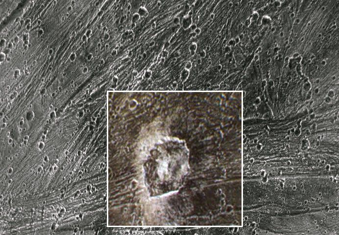 View of the dark ray crater Kittu on Jupiter's moon, Ganymede. Kittu is seen in approximately true color, as imaged with the Galileo camera's violet, one micrometer, and near infrared filters. The crater shows a bright white central peak and rim, and dark brownish material surrounding it. Diffuse dark rays, sprinkled thinly atop surrounding grooved terrain, emanate from the impact site. The dark material dusted over the surface is probably part of a dark impactor (asteroid or comet) which was strewn across the surface upon impact. The impactor hit grooved terrain, and a straight segment of the crater's rim was created when a portion of the rim collapsed along the trend of an older fault.