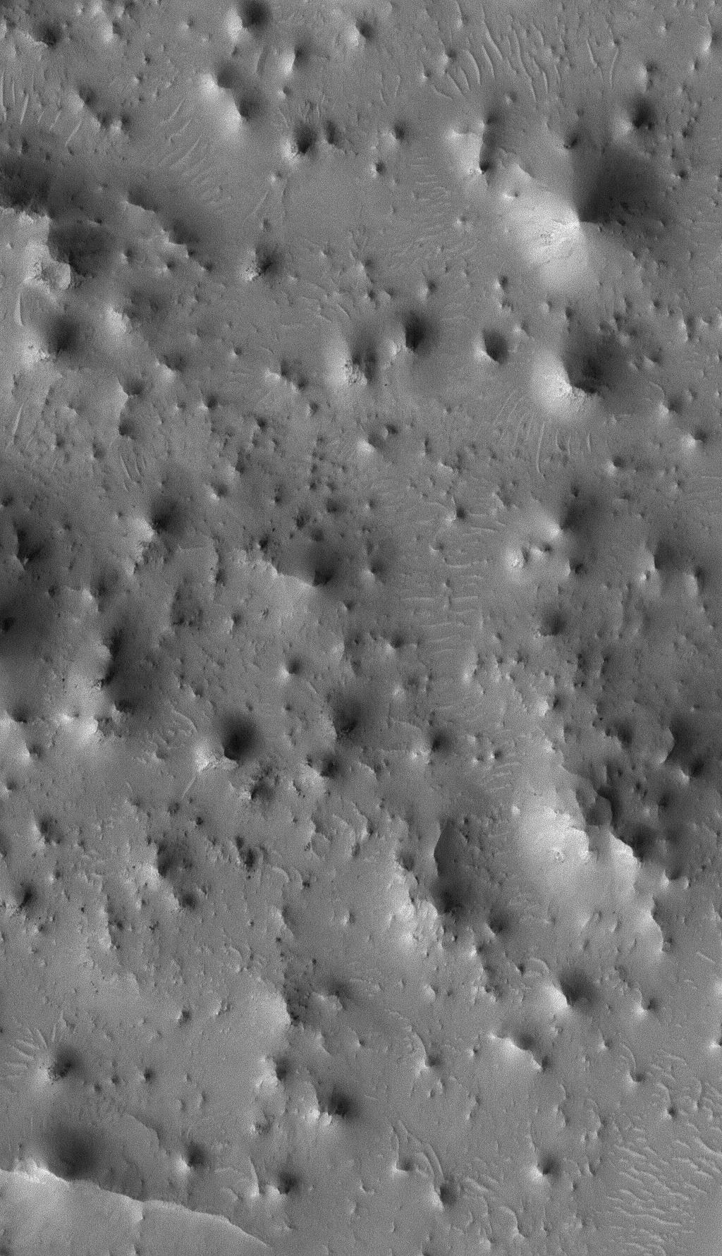This Mars Global Surveyor (MGS) Mars Orbiter Camera (MOC) image shows a 1.4 meters per pixel (~5 ft/pixel) view of an eroded landscape north of the crater, Antoniadi, in far eastern Arabia Terra. Each knob and butte in this image is a remnant of a formerly more-extensive layered rock unit that has been largely eroded away.