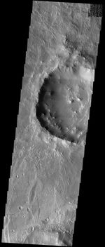 Note: this THEMIS visual image has not been radiometrically nor geometrically calibrated for this preliminary release. An empirical correction has been performed to remove instrumental effects. A linear shift has been applied in the cross-track and down-track direction to approximate spacecraft and planetary motion. Fully calibrated and geometrically projected images will be released through the Planetary Data System in accordance with Project policies at a later time.