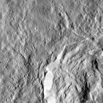 This image obtained by NASA's Dawn spacecraft shows a field of small craters next to Kokopelli Crater, seen at bottom right in this image, on dwarf planet Ceres. The small craters overlay a smooth, wavy material that represents ejecta from nearby Dantu Crater. The small craters were formed by blocks ejected in the Dantu impact event, and likely from the Kokopelli impact as well.