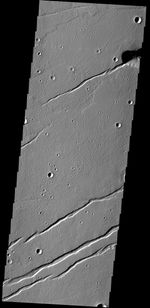 The depressions in this VIS image are graben that make up part of Labeatis Fossae. Graben are tectonic features comprised of a fault bounded depression where the central block of material has been downdropped between the two faults.