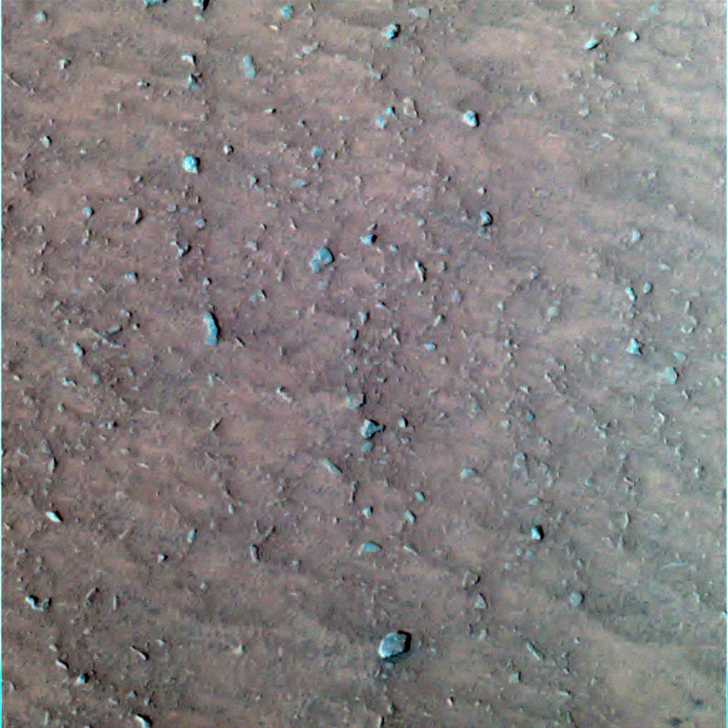 This image shows the patch of soil at the bottom of the shallow depression dubbed "Laguna Hollow" where the Mars Exploration Rover Spirit will soon begin trenching. Scientists are intrigued by the clustering of small pebbles and the crack-like fine lines, which indicate a coherent surface that expands and contracts. A number of processes can cause materials to expand and contract, including cycles of heating and cooling; freezing and thawing; and rising and falling of salty liquids within a substance. This false-color image was created using the blue, green and infrared filters of the rover's panoramic camera. Scientists chose this particular combination of filters to enhance the heterogeneity of the martian soil.