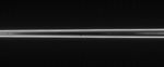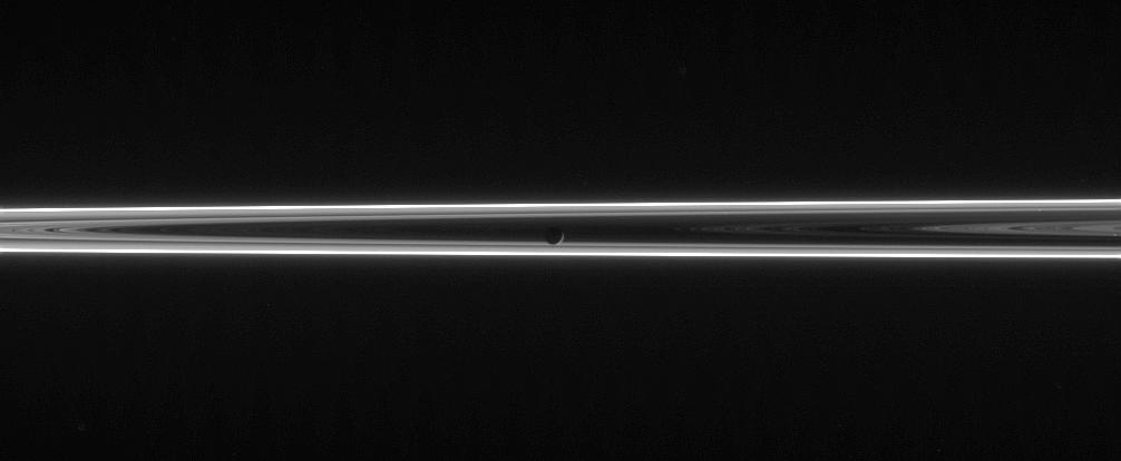 The narrow and twisted F ring lights up this scene, which features Mimas against the unlit side of Saturn's ringplane. The F ring contains a great deal of fine, icy particles that are quite effective at scattering sunlight at high phase angles.