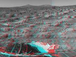 Many prominent rocks near the Sagan Memorial Station are featured in this image, taken in stereo by the Imager for Mars Pathfinder (IMP) on Sol 3. 3D glasses are necessary to identify surface detail. The two hills in the distance, approximately one to two kilometers away, have been dubbed the "Twin Peaks" and are of great interest to Pathfinder scientists as objects of future study. The white areas on the left hill, called the "Ski Run" by scientists, may have been formed by hydrologic processes. A lander petal, airbag, and the rear ramp are at the lower area of the image.