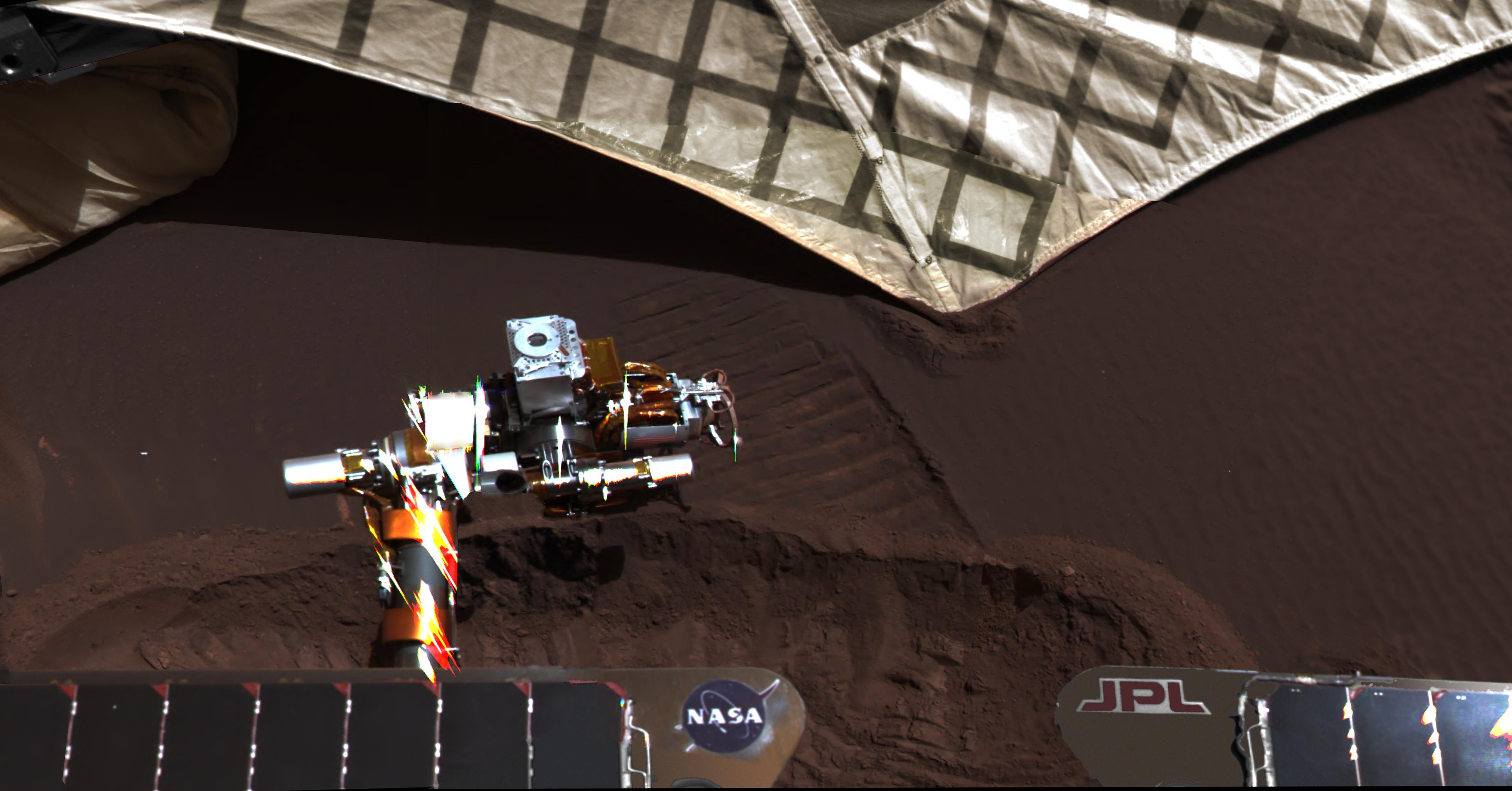 On March 20, 2004, NASA's Mars Exploration Rover Opportunity used a wheel to dig a trench revealing subsurface material beside the lander hardware that carried the rover to the surface of Mars 55 Martian days, or sols, earlier.