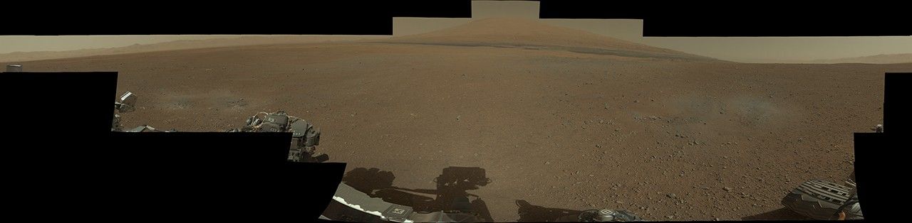 This color panorama shows a 360-degree view of the landing site of NASA's Curiosity rover, including the highest part of Mount Sharp visible to the rover. That part of Mount Sharp is approximately 12 miles (20 kilometers) away from the rover.