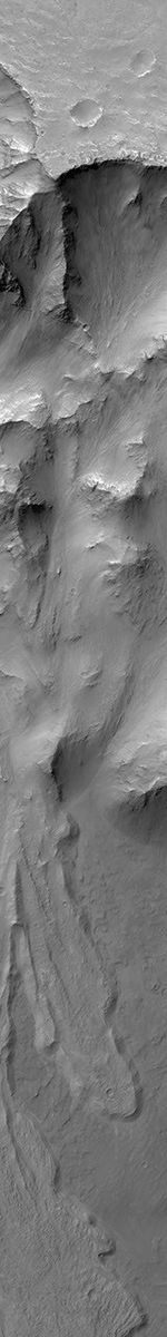 This Mars Global Surveyor (MGS) Mars Orbiter Camera (MOC) image shows part of a large landslide complex off the north wall of Coprates Chasma in the Valles Marineris trough complex. The wall of Coprates Chasma occupies much of the upper and middle portions of the image; the landslide lobes are on the trough floor in the bottom half of the image. Large boulders the size of houses can be seen on these landslide surfaces. This image is locatednear 13.9°S, 56.7°W. The picture covers an area about 3 km (1.9 mi) wide. Sunlight illuminates the scene from the upper left.