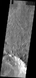 Note: this THEMIS visual image has not been radiometrically nor geometrically calibrated for this preliminary release. An empirical correction has been performed to remove instrumental effects. A linear shift has been applied in the cross-track and down-track direction to approximate spacecraft and planetary motion. Fully calibrated and geometrically projected images will be released through the Planetary Data System in accordance with Project policies at a later time.