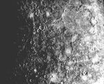 Close-up view of one-half of a 1300-km diameter circular basin the largest observed on Mercury. The other half is hidden beyond the terminator to the left. Hills and valleys extend in a radial fashion outward from the main ring. Interior of the large basin is completely flooded by plains materials; adjacent lowlands are also partially flooded and superimposed on the plains are bowl shaped craters. Wrinkle ridges are abundant on the plains materials. The area shown is 1008 miles (1600 km) from the top to the bottom of the picture. Sun's illumination is from the right. Blurred linear lines extending across the picture near bottom are missing data lines that have been filled in by the computer. Mariner 10 encountered Mercury on Friday, March 29th, 1974, passing the planet on the darkside 431 miles (690-km) from the surface.
