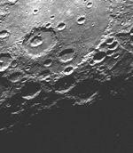 As Mariner 10 passed by Mercury on its second encounter with the planet on September 21, 1974, this picture (FDS 166850) of a large circular (350 kilometer, 220 mile diameter) basin was obtained near the morning terminator. The basin appears to have been flooded with the plain material and then subsequently cratered by numerous large events. Filling of the basin, presumably by lava flows analogous to those of the lunar maria, partially inundated small craters which had formed along the basin rim (lower left) and in some places overflowed the basin rim and spilled onto the surrounding terrain (top).