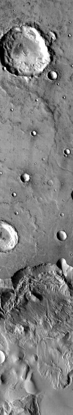 Note: this THEMIS visual image has not been radiometrically nor geometrically calibrated for this preliminary release. An empirical correction has been performed to remove instrumental effects. A linear shift has been applied in the cross-track and down-track direction to approximate spacecraft and planetary motion. Fully calibrated and geometrically projected images will be released through the Planetary Data System in accordance with Project policies at a later time.