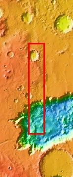 The large landslide at the bottom of this INFRARED image is located in Ophir Chasma. Although the resolution is less than a VISIBLE image, the large size of the feature is more completely covered by the wider frame size of the THEMIS infrared camera.