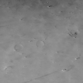 The above two pictures (MOC2-141a and MOC2-141b, top row) are centered near 36°N, 159°W in northern Amazonis Planitia. Each image covers an area 88 kilometers (55 miles) across, and each shows similar features on the ground, such as the two partially-buried craters at the center left.