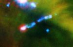 The red color at the end of the lower jet represents shock-heated iron, sulfur and dust, while the blue color in both jets denotes shock-heated hydrogen molecules.