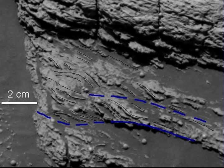 In the central part of the image, the dip of fine layers at angles to each other (cross laminae) suggests that the water that created the cross-lamination was flowing from left to right. Interpretive blacklines trace these cross-laminae. Interpretive blue lines indicate boundaries of possible sets of cross-laminae (Figure 1).