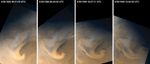 The four still-frame images (above) show the evolution of a storm system that developed over the martian north polar region on June 30, 1999. Each picture was taken approximately 2 hours later than the previous. The north polar ice cap is the white feature at the center of each frame. Clouds that appear white consist mainly of water ice, clouds that appear orange/brown contain dust.