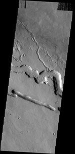 The channels and linear depression in this VIS image are located on the western margin of the Elysium Volcanic complex. The channels were created by lava flow.