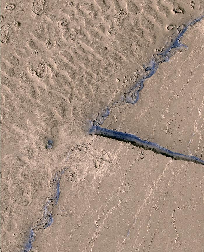 This image from HiRISE image PSP_003294_1895 shows a portion of the Athabasca Valles channel system. Part of a streamlined "island" is visible on the right, and dune-like landforms that occur on the channel floor can be seen on the left. At higher resolution it is apparent that a thin layer of solidified lava coats both the dune-like landforms and the topographically higher streamlined island. Two impact craters within the subscene can be identified by the relatively bright-rayed ejecta that surround them. Most of the region is dusty and, therefore, fairly uniform in color. However, blue tinges in the HiRISE false color data delineate scarps that are too steep for dust to accumulate. One such scarp appears where a narrow fracture cuts through the streamlined island. Another appears on the topographic step at the edge of the streamlined island.