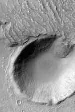 This Mars Global Surveyor (MGS) Mars Orbiter Camera (MOC) picture obtained in April 2003 shows the margin of a large lava flow south of Tharsis near 33.5°S, 137.5°W. Some of the lava broke out and poured into an adjacent crater formed by meteor impact. The picture covers an area about 3 km (1.9 mi) wide; the crater is more than twice the size of the famous Meteor Crater in northern Arizona, U.S.A. Sunlight illuminates the scene from the upper left.