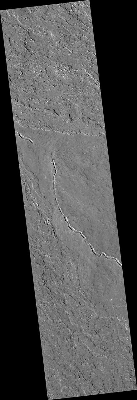 This image shows a lava channel, which lies just to the east of the largest volcano in the solar system: Olympus Mons.
