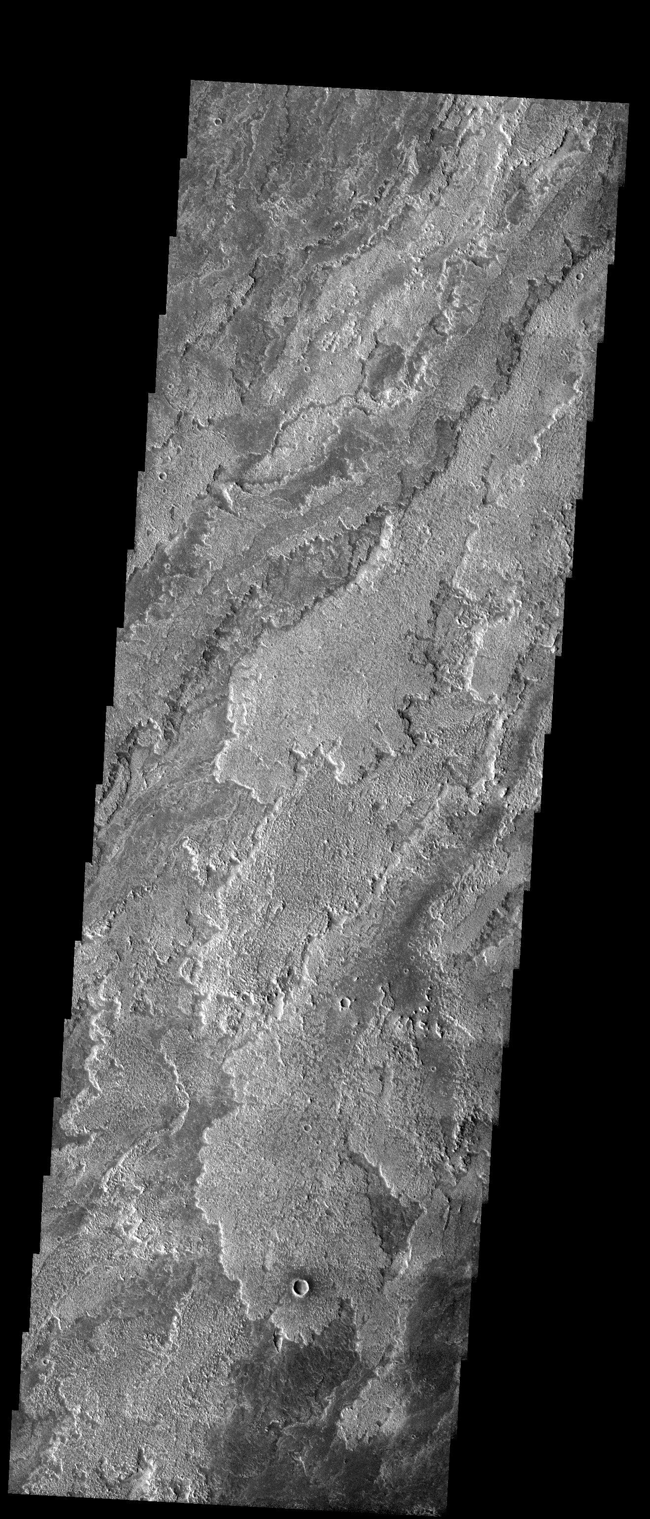 Remarkable differences in brightness and texture are apparent between these lava flows found on the southern flanks of Arsia Mons. These differences could be due to variations in composition, age, vessicularity, or degrees of weathering