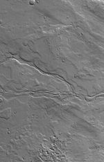 This Mars Global Surveyor (MGS) Mars Orbiter Camera (MOC) image shows the remains of leveed lava channels cutting across (west to east) a dust-covered plain composed of overlapping lava flows east of Olympus Mons, a giant volcano in the Tharsis region of Mars.