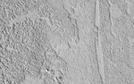 A thick lava flow came in from the west, and you can see the cooled flow lobes and wrinkled upper surface. East of the flow margin, this most recent flow also coursed over an older lava surface which shows some long, north-south breaks, and in the southeast corner, an arrowhead-shaped set of ridges. These textures are most likely from rafted slabs of lava. Under certain conditions, a large piece of lava can cool, but then detach and move like an iceberg over a cushion of still-molten lava.