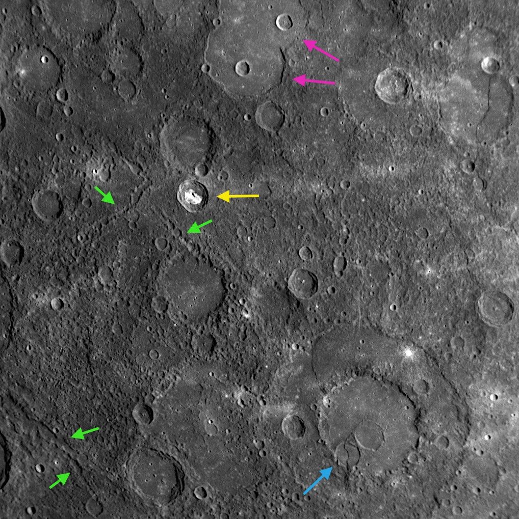 This NAC image displays a number of interesting geologic features characteristic of Mercury’s surface. The crater indicated by the yellow arrow has unusual bright material on its floor, likely due to rocks of a different chemical composition. Bright material also has been seen in the craters Sander and Kertész. The pink arrows point to a pair of larger and older craters that have been flooded with now solidified volcanic lava, similar to flooding seen at the impact basin Raphael. In the lower right-hand corner of the image is a large peak-ring basin, about 210 kilometers (130 miles) in diameter, which also appears to have been flooded with lava. There is a small scarp (cliff) within that basin that cuts through a smaller crater at the edge of the basin's inner ring, at the point indicated by the blue arrow. Scarps on Mercury are often seen intersecting impact craters, such as this dramatic, previously released image from the mission's second Mercury flyby (see PIA11358). The green arrows on the left side of the image indicate a series of secondary crater chains. Chains of small craters such as these are formed when ejecta are expelled from a primary crater after the initial impact. Secondaries are widespread across Mercury's surface, as was also discussed in the caption to this previously released image (see PIA10178). Unraveling Mercury's geologic history requires investigating the complex and overlapping relationships of volcanic plains, impacts, and scarps seen on the planet's surface.