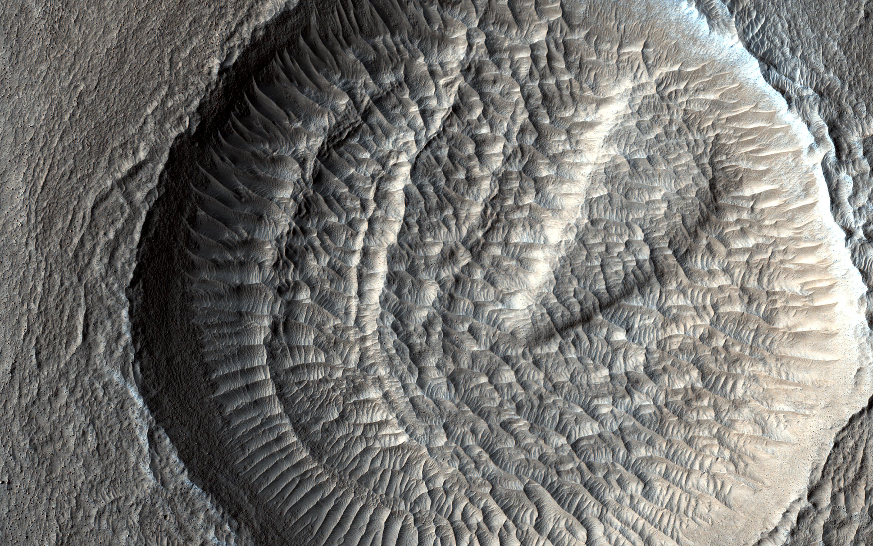 Outside of the craters and along the crater floors, the ripples are all oriented in the same direction. However, along the walls of some of the larger craters, the ripples are situated radially away from the center, indicating the winds moving inside the larger craters can be influenced by the topography of the crater wall.