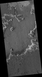 The cutout from the top center part of the image shows this stack. The dark unit is thin and breaking into boulders. The light material is actually divided into smaller layers, and is pervasively fractured. However, the boulders falling from the edge are mostly small and rarely remain intact if they move more than a few meters. The cracking of the layer could be due to water loss from the layer, or to regional tectonic effects such as stresses from burial and erosion. The base unit is partially covered by wind-blown ripples.