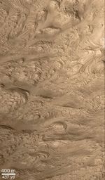 Hundreds of layers of similar thickness, texture, and pattern have been exposed by erosion in a 64 kilometer-wide (40 mile-wide) impact crater in western Arabia Terra at 8°N, 7°W. In other words, these layers provide a record of repeated, episodic changes that took place at some time far in the martian past, when this particular impact crater was the site of sediment deposition. Layers toward the center of the crater are nearly horizontal, but those closer to or draping over the crater walls are tilted (geologist use the term dipping) toward the basin center. These relationships suggest that the sediments that created these layers were deposited from above--perhaps by settling out of the martian atmosphere, or perhaps by settling out of water that might have occupied this crater as a lake.