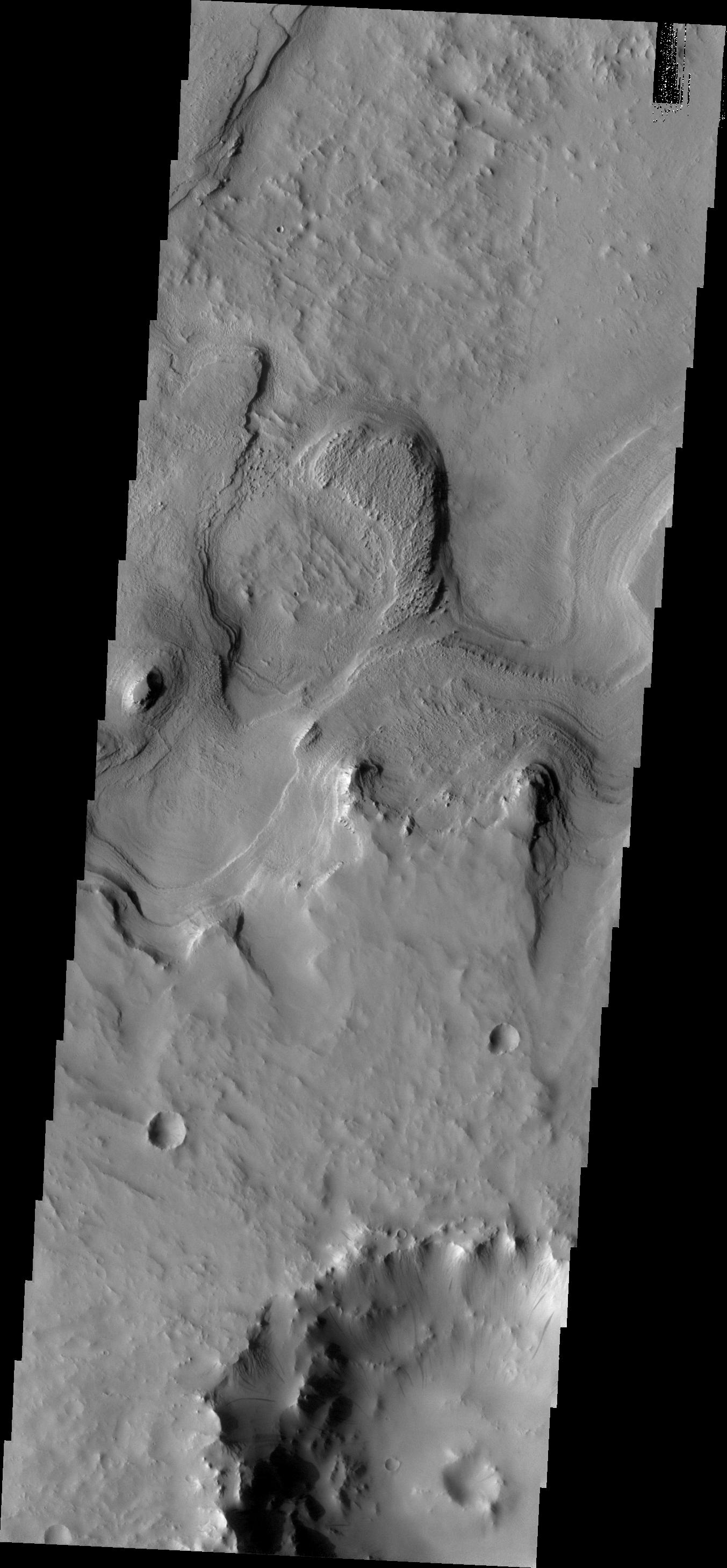 Layered material surrounds in this unnamed crater in Terra Sabaea.