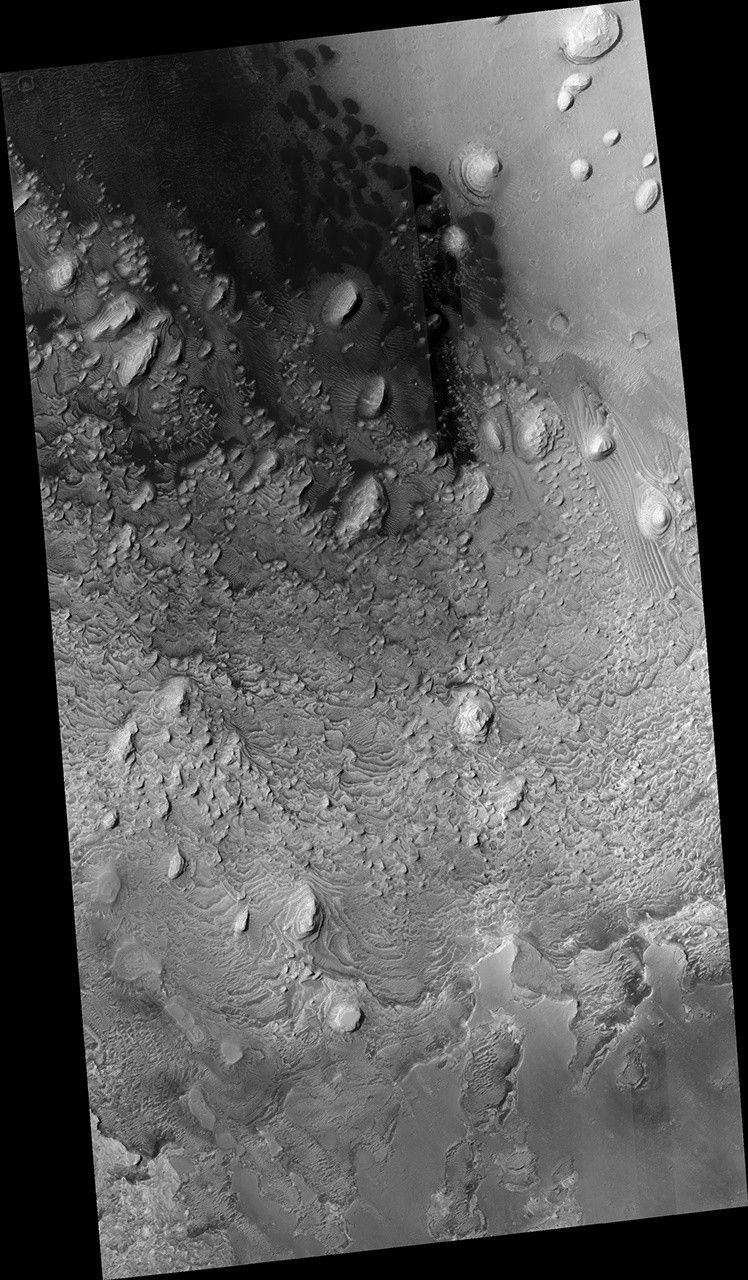 This formation extends west and east. Similar layered rocks are within several craters in Arabia Terra and Meridiani Planum, including Sera and Banes craters. The similarities suggest that the same process was forming deposits over a large geographic area long ago. Our image also indicates that much of the formation has eroded away relative to what has remained.