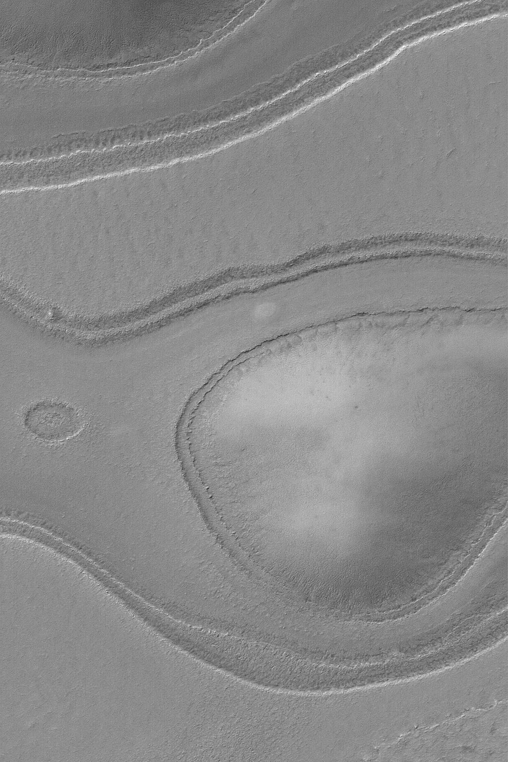 This Mars Global Surveyor (MGS) Mars Orbiter Camera (MOC) image shows layer outcrops near the rim of South Crater, in the south polar region of Mars. These ancient layered materials surround an even older knob--the rounded feature at right/center. This picture is located near 78.0°S, 336.0°W, and covers an area 3 km (1.9 mi) wide. Sunlight illuminates the scene from the upper left.