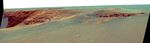 This view of "Victoria crater" is looking southeast from "Duck Bay" towards the dramatic promontory called "Cabo Frio." The small crater in the right foreground, informally known as "Sputnik," is about 20 meters (about 65 feet) away from the rover, the tip of the spectacular, layered, Cabo Frio promontory itself is about 200 meters (about 650 feet) away from the rover, and the exposed rock layers are about 15 meters (about 50 feet) tall. This is an enhanced false color rendering of images taken by the panoramic camera (Pancam) on NASA's Mars Exploration Rover Opportunity during the rover's 952nd sol, or Martian day, (Sept. 28, 2006) using the camera's 750-nanometer, 530-nanometer and 430-nanometer filters.