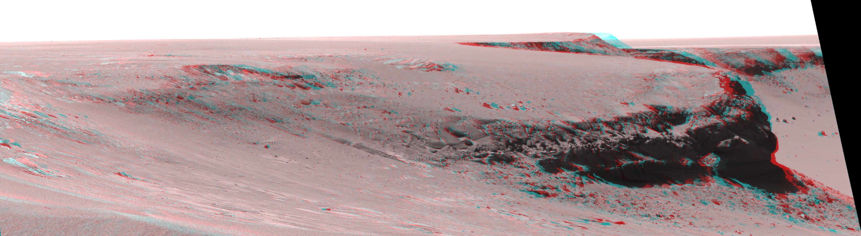 This view of Victoria crater is looking north from "Duck Bay" towards the dramatic promontory called "Cape Verde." The dramatic cliff of layered rocks is about 50 meters (about 165 feet) away from the rover and is about 6 meters (about 20 feet) tall. The taller promontory beyond that is about 100 meters (about 325 feet) away, and the vista beyond that extends away for more than 400 meters (about 1300 feet) into the distance. This is a red-blue stereo anaglyph generated from images taken by the panoramic camera (Pancam) on NASA's Mars Exploration Rover Opportunity during the rover's 952nd sol, or Martian day, (Sept. 28, 2006) using the camera's 430-nanometer filters.