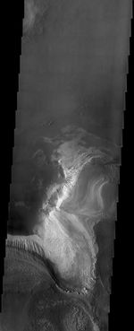 A cliff of many terraces steps down from the south to the north in this image, showing many successive layers of material now eroded and exposed to the wind. A relatively thick and bright layer comprises one of the lowest strata, appearing more fluted and scarred by the wind than upper layers. Small bright bedforms near the terraces are probably composed of particulate material shed from this bright layer.