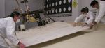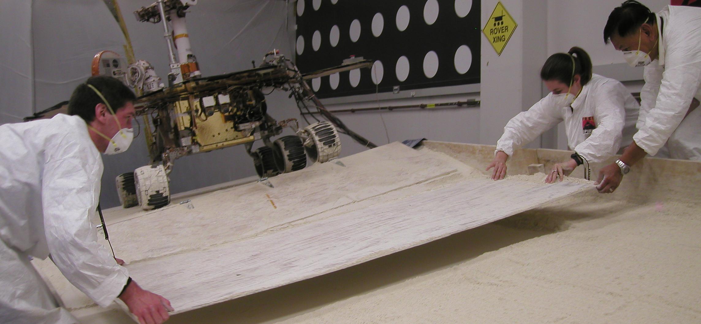 A test setup at NASA's Jet Propulsion Laboratory enables experiments with maneuvers being considered for use by NASA's Mars Exploration Rover Spirit to get Spirit out of soft soil where it has become embedded. In this image from Aug. 12, 2009, rover team members are moving a board used in getting the setup ready for the next test. From left: Matt Van Kirk, Julie Townsend, Tam Nguyen. Once the board is in place, the test crew applies weight to it to moderately compress the mixture of clay powder and diatomaceous earth being used as a simulation of the Martian soil underneath Spirit.