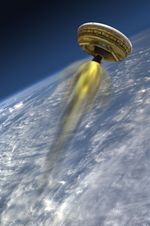 This artist's concept shows the test vehicle for NASA's Low-Density Supersonic Decelerator (LDSD), designed to test landing technologies for future Mars missions. A balloon will lift the vehicle to high altitudes, where a rocket will take it even higher, to the top of the stratosphere, at several times the speed of sound.